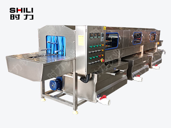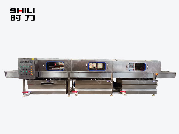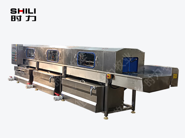 整機采用四面噴淋,三段清洗,第一段為熱堿水,第二段為熱清水,第三段為自來清水,熱水箱兩段內(nèi)分別設(shè)有電加熱管道;帶有溫度控制裝置,溫度從常溫至90°C自由設(shè)定。各個循環(huán)水箱均采用臥式加立式不銹鋼離心水泵循環(huán)噴淋,從上、下、左、右,四個方向同時對產(chǎn)品進行噴淋沖洗;需清洗的產(chǎn)品由不銹鋼鏈條輸入清洗機中,依次通過人工上桶→ 自動除渣→高壓主洗→高溫預(yù)漂洗→高溫清水漂洗連續(xù)式清洗;每個水箱均設(shè)有過濾網(wǎng)裝置,便于隨時清理。