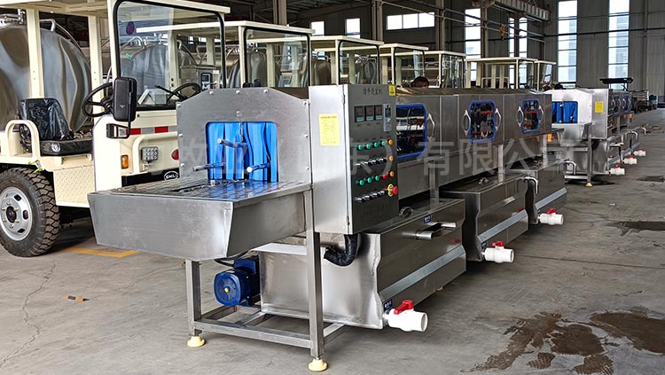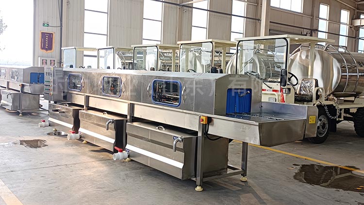 和國內(nèi)多個大型牧場建立合作關(guān)系,整機設(shè)備采用折彎式水箱,水箱內(nèi)部加裝過濾網(wǎng),自動補水,水箱上端加蓋子節(jié)約能源,內(nèi)部采用電加熱,水位可控,電加熱自動保護,變頻調(diào)速電機,根據(jù)現(xiàn)場實際情況進行速度的調(diào)節(jié),可控溫,調(diào)溫,所有水泵均采用不銹鋼泵頭,水泵進口處加裝二次過濾,內(nèi)部所有噴淋管全部是快拆式結(jié)構(gòu),防止噴淋管阻塞,噴頭可以360度調(diào)節(jié),雙卡扣,每道清洗處均采用軟簾連接,防止串水,整機采用sus304不銹鋼制造。